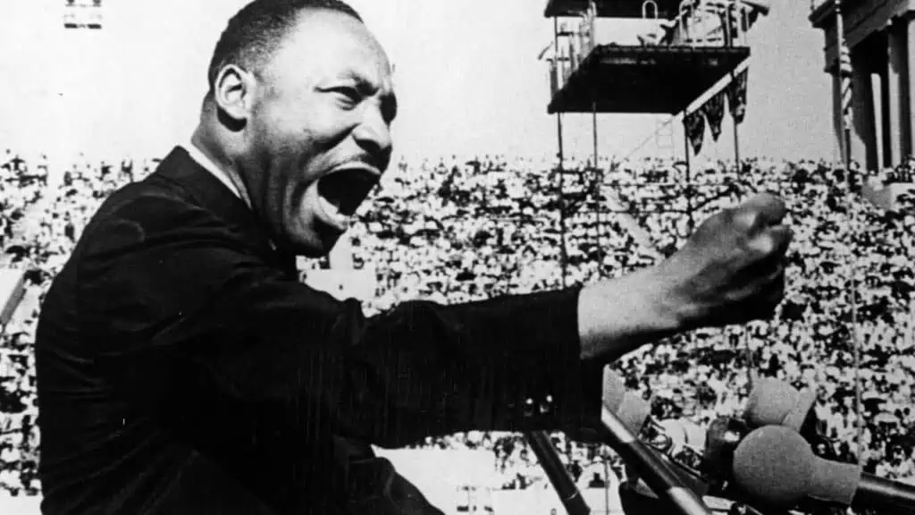 Martin Luther King Jr. era un ministro cristiano y uno de los líderes más prominentes en el movimiento de los Derechos Civiles, desde 1955 hasta su asesinato en 1968. Participó y lideró marchas en el Sur por el derecho al voto, la desegregación y los derechos laborales. Entre ellas, el boicot de autobuses de Montgomery de 1955, las protestas de 1963 en Birmingham, Alabama, y muchas más. Fue uno de los líderes de la Marcha de 1963 en Washington, donde pronunció su discurso “Tengo un sueño”. Ayudó a organizar dos de las marchas desde Selma a Montgomery, durante el movimiento por el derecho al voto de 1965 en Selma, Alabama. Fue detenido al menos 29 veces. El FBI lo convirtió en objeto de su programa secreto COINTELPRO (Programa de Contrainteligencia) desde 1963 hasta su asesinato el 4 de abril de 1968.