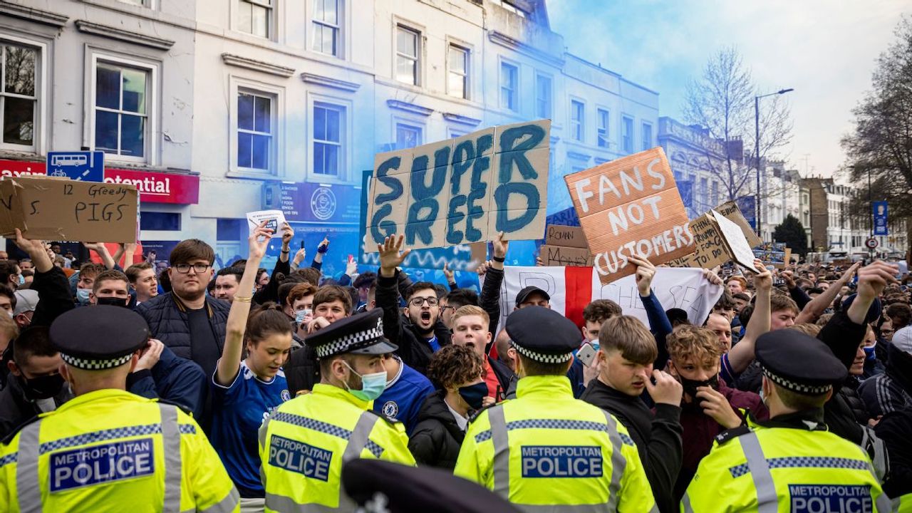 A protest against the Super League outside Stamford Bridge near London. (Rob Pinney/Getty Images)