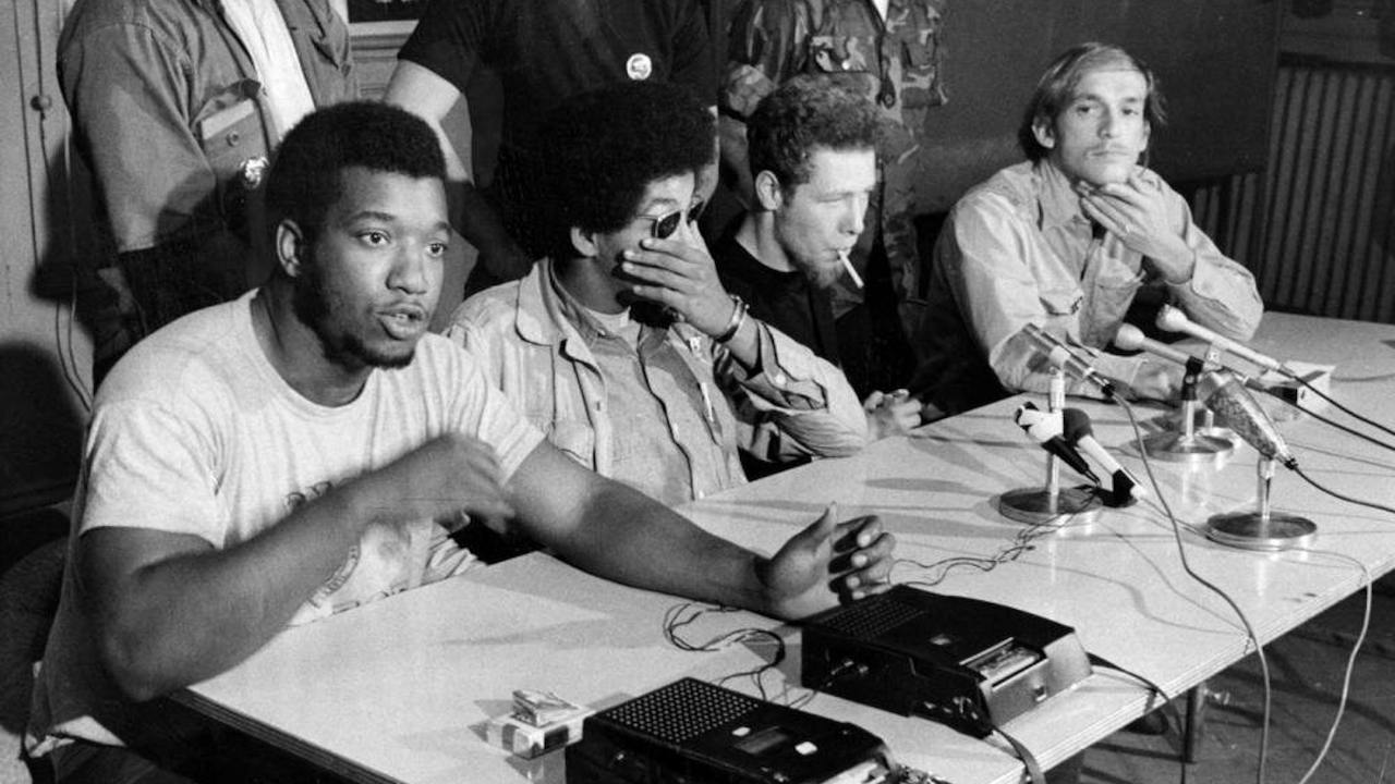 Hampton (seated left) at 1969 meeting with Young Lords representatives from New York and Chicago, and SDS representative.