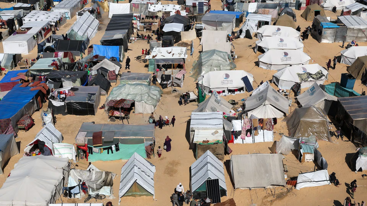 Displaced Palestinians take shelter in a tent camp in Rafah, the southern most city in Gaza, February 14., 2024 (Reuters/Ibraheem Abu Mustafa)