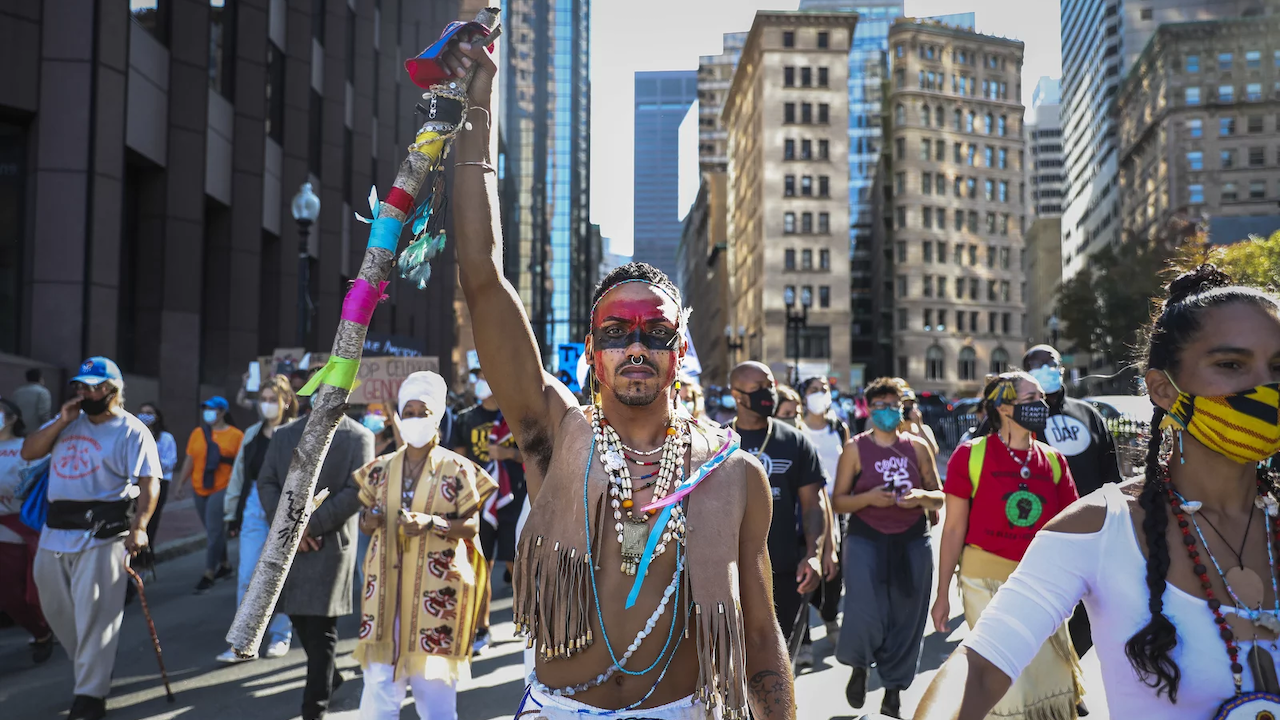 Indigenous Peoples’ Day rally in Boston on Oct. 10, 2020. {Erin Clark/Boston Globe}