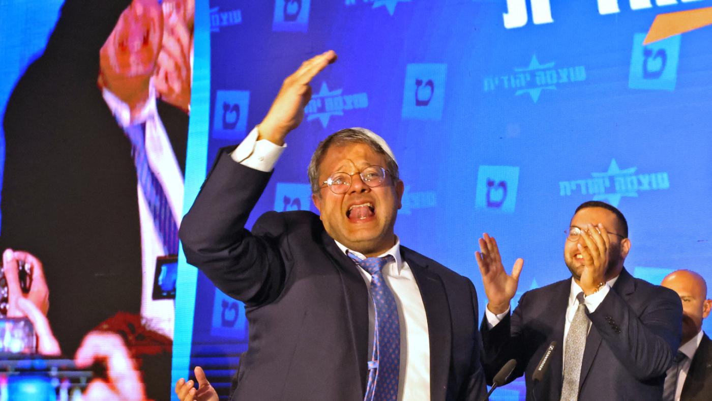 Far-right Israeli politician Itamar Ben-Gvir addresses celebrating supporters at campaign headquarters in Jerusalem on 2 November 2022 (AFP)