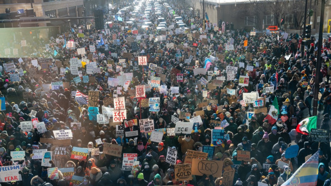 A crowd of between 50,000 and 100,000 people assembled in Minneapolis on the afternoon of Friday, January 23 in -9° F conditions, to demand an end to the recent terror campaign and occupation of their city by Immigration and Customs Enforcement (ICE) and Border Patrol. The city was engaging in a powerful day of protest that many envisioned as a general strike or “economic blackout.” The federal government has sent 3,000 masked agents to kidnap, attack, brutalize, and in some cases murder anyone they see as a target or obstacle in Minneapolis and the surrounding area.