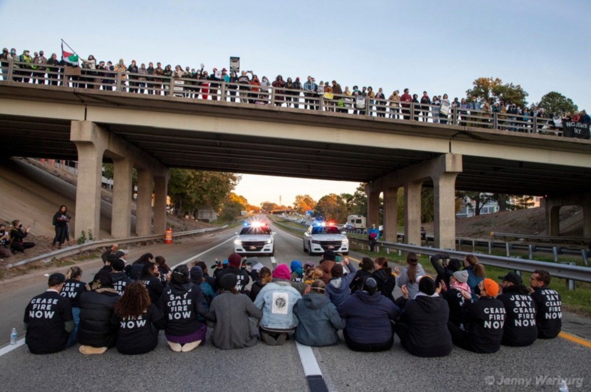 On Thursday afternoon, November 2, the Durham, North Carolina branch of Jewish Voices For Peace led 200 or more protestors against Israel’s merciless war on the people of Gaza in a lunch hour march through downtown Durham. Protesters then marched onto a nearby highway where some 40 sat down, blocking traffic for more than two hours during rush hour. Demonstrators called for an immediate ceasefire and condemned local Democratic party Congresswoman Valerie Foushee for her vocal support of the murderous far-right-wing government of Israeli President Netanyahu.