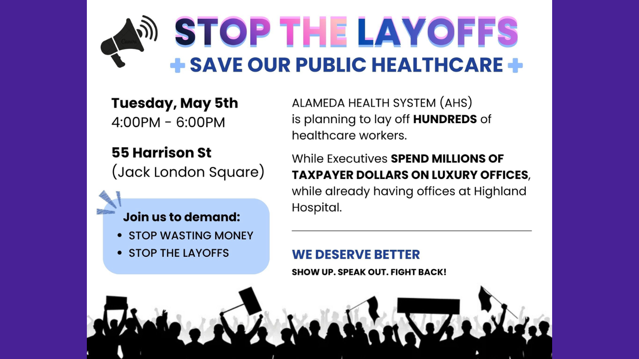 Join AHS workers and fellow community members on May 5th from 4-6pm for a rally outside the AHS executives’ Jack London Square offices!