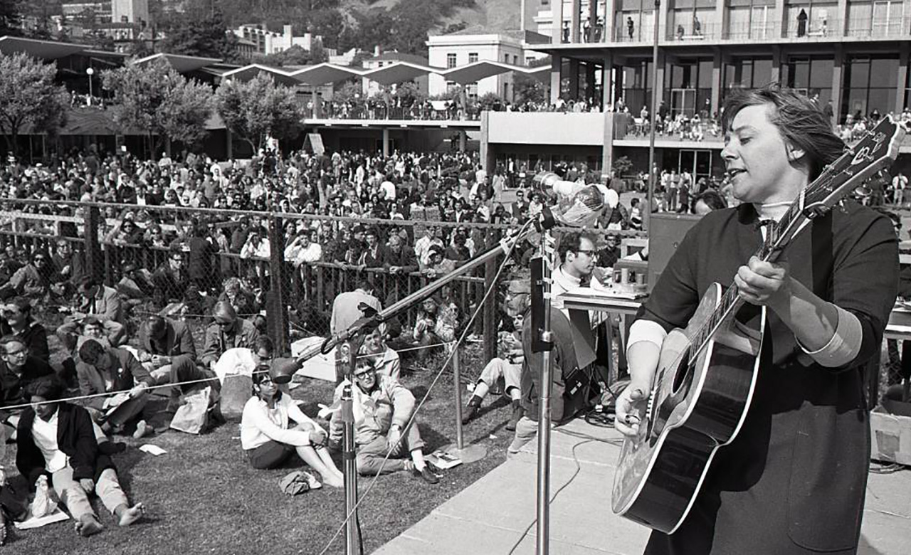 She threw herself into social struggles more deeply than almost any other artist of her time or any other, performing at marches, rallies, teach-ins, even travelling to Cuba and North Vietnam to support their struggles against imperialism. She was equally at home in the struggles for Black liberation, workers’ rights, women’s rights, free speech and students’ rights, and against the Vietnam War. Her favorite song was Solidarity Forever, the rousing anthem of workers and union power, which she often sung with fellow folk singer and activist Pete Seeger. Reflecting on the relationship between art and politics, she once said that “one must participate in the emerging struggle around them in order to make art that reflects it…if you don’t know what to write about, remember that truth and reality is what we’re after. You have to know reality to tell the truth about it. You got to get out and be a part of it.”