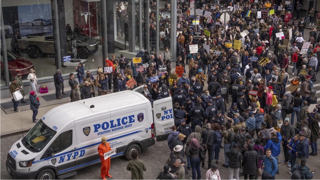 Protestors at a Tesla location in New York City on March 1. (AP Photo)