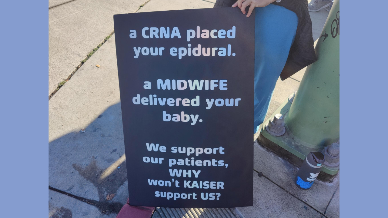 One sign said: “a CRNA placed your epidural. a MIDWIFE delivered your baby. We support our patients, WHY won’t Kaiser support us?” Good question!