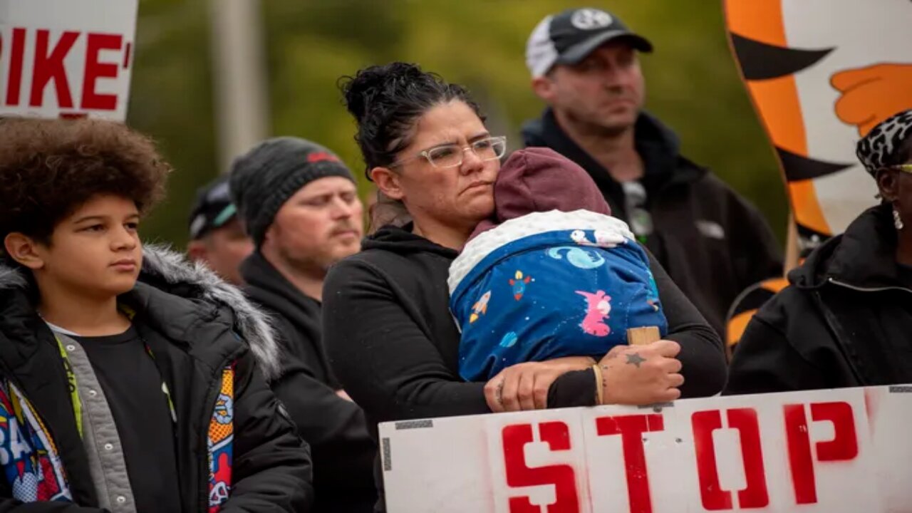 Striking Kellogg’s workers and their families at a rally outside of the Kellogg’s corporate headquarters. (Image Credit: Alyssa Keown)