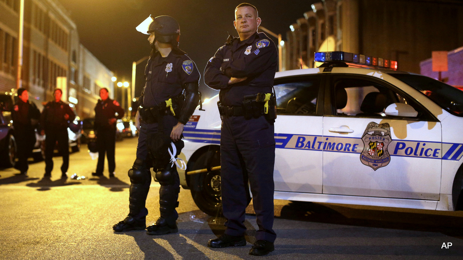 Members of the Baltimore Police Department wait for curfew to begin for the third night, Thursday, April 30, 2015, in Baltimore. (AP Photo/Patrick Semansky)